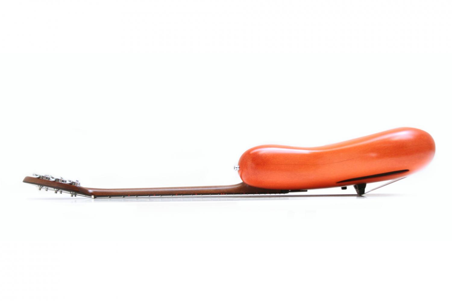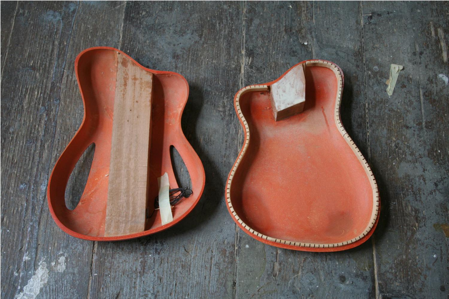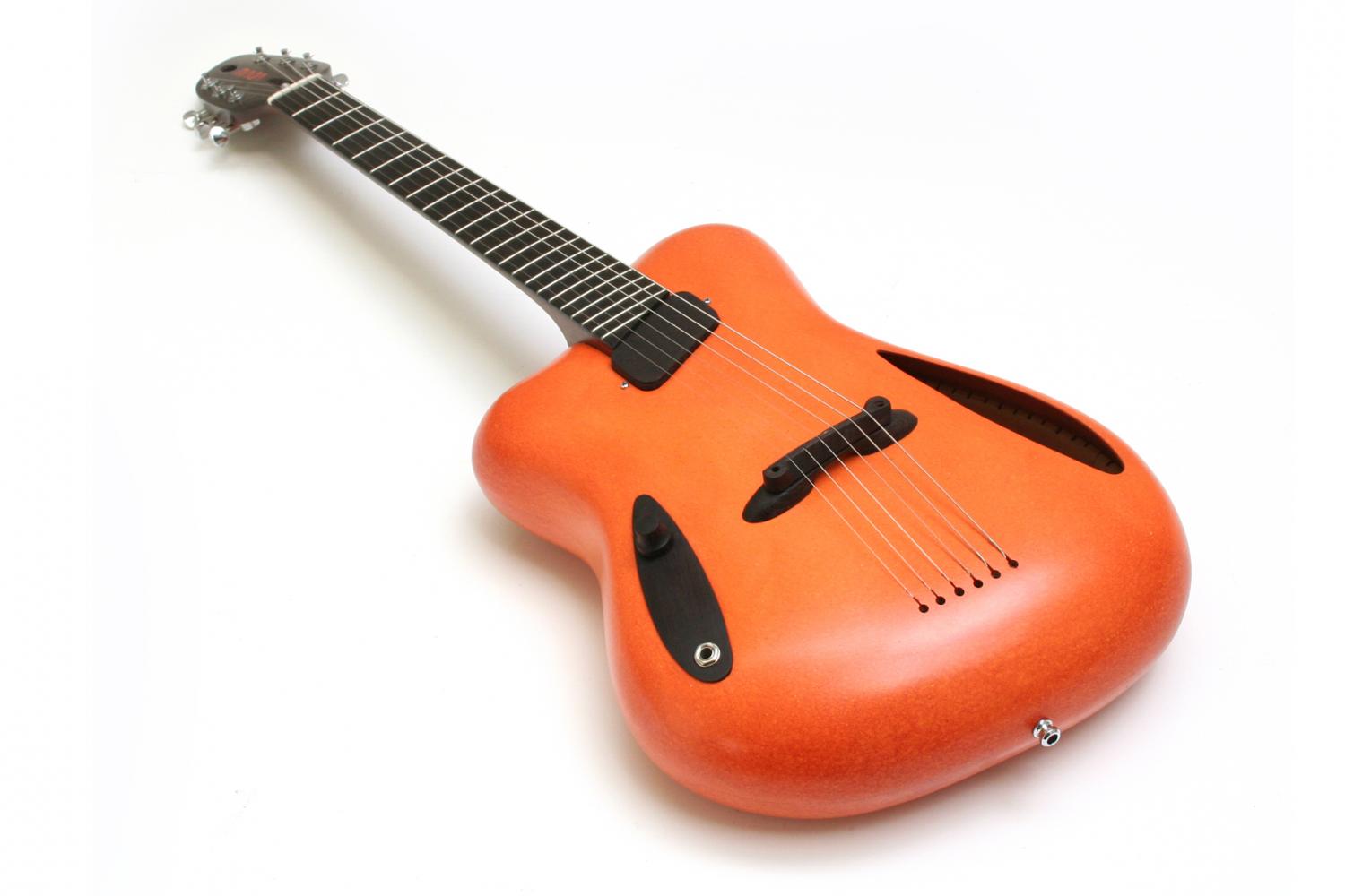 Mada Suoca was the topic of Adam W. Swiczinsky's master thesis on acoustic guitars with hempstone bodies at the University of Applied Arts in Vienna, thesis advisor Prof. Paolo Piva. The concept was to rethink guitar production. Don't cut a log into pieces, let it rest for decades, and then glue it back together again, but mold an acoustic guitar body out of one piece: Low emission, get the material from a radius of max. 500km distance, and let the guitar adapt to the body of the playing person. Be organic! The bodies were molded by Zellform in Upper Austria.